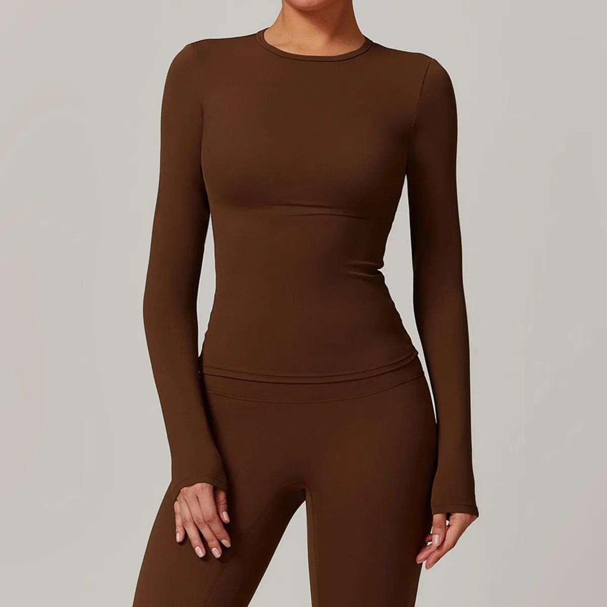 Den här långärmade toppen är tillverkad av hudvänlig nylonammoniak och ger lätt komfort och fukttransporterande egenskaper. Den smickrande runda halsen och den smala passformen framhäver din silhuett och gör den idealisk för fitness eller streetwear.